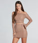 Showcase your bling in this mesh crop top to attract all the attention! It features fitted long sleeves with flared slit cuffs. a cowl neckline. a cropped hem. and all-over faux pearl and rhinestone embellishments for a glam allure. The sheer mesh fabric includes a knit lining. Complete your glitzy look for your a birthday or holiday party with the matching mini skirt.