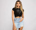 Flaunt what your mama gave ya in this stylish tee! The tee features a crew neckline. short sleeves. a script that reads: "I got it from my mama" with a small heart outline and a cropped knot hem. The tee is composed of a cotton knit fabric that offers a relaxed fit with a moderate stretch. Complete look with a mini skirt.