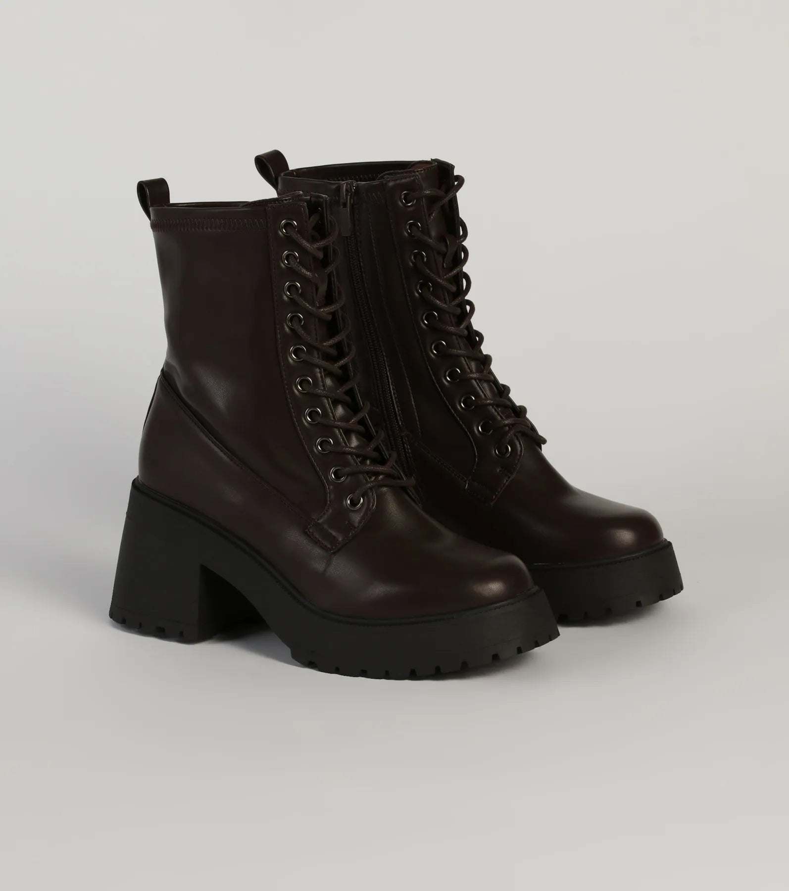 What are you waiting for? Get an edgy look in these faux leather lug booties for the perfect street style! The boots feature a round toe. a front lace-up placket. an inner side zipper. a chunky lug sole. and a block heel. Complete the look with an oversized blazer.