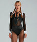 Maximize your goth-prep swagger with this sultry mesh bodysuit! Featuring sheer fitted long sleeves. woven contrast cuffs with button closures. woven contrast collar neckline. adjustable neck tie. button-down front. sheer form-hugging bodice with satin trim. and satin bikini bottom with dual snap-button closures. this bodysuit will turn heads and raise temps! Flaunt your style and slay completing your look with a mini skirt and chunky heels for a party.