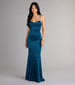 Bring the charm in a long lace dress that features a sleeveless cowl neckline. adjustable spaghetti straps. an open-back design accented with a bar back. a floral lace pattern. and a mermaid silhouette. Complete the look with a sleek rhinestone clutch for the perfect wedding guest outfit.Â