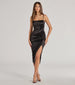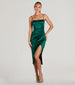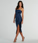 Be radiant in the fiery Harriet formal satin midi dress perfect for bridesmaids. rehearsal dinners. or banquets! She features a figure-snatching corset-designed bodice with a square neckline. adjustable spaghetti straps. and flexible boning inserts. A side pleated seam leads to the bodycon silhouette showcasing a high front wrap slit along the midi-length hem. The formal dress is crafted from a glossy and sleek satin fabric that exudes sophistication! Complete the look with earrings and block heels.