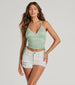 Care to have it all with this sultry crop top? It boasts a halter V-neckline with a spaghetti strap tie. a low back cut to flaunt some skin. and adjustable side drawstrings let you customize the fit along the cropped hem. Complete the look in women's best-selling bottoms for any casual occasion!