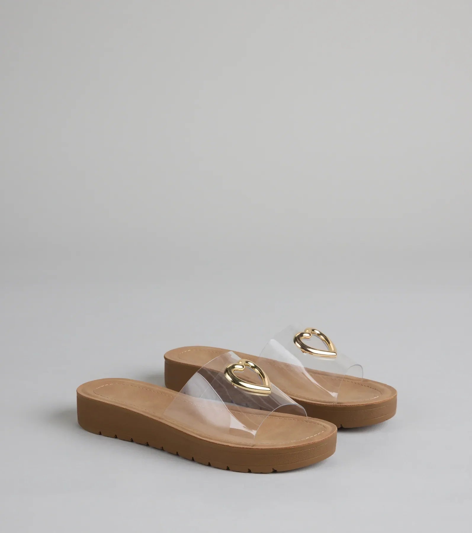 These comfy-cute slides feature a clear strap topped with a bold heart charm—perfect for pool days. park hangs. or running errands like a style icon.