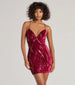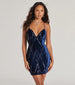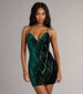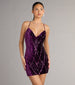 A sleeveless mini dress features a sultry V-neckline. spaghetti straps that shape the lace-up back meant to attract eyes. and a bodycon silhouette. The velvet-lined fabric is embellished with a stunning sequin pattern. Perfect for the school dance or banquet.