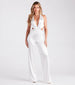 Look absolutely heavenly with a luxe glow in this satin jumpsuit for the perfect night! It features a sleeveless halter plunge V-neckline. tie-back neck closure. a cutout waist and open back design and a flattering straight-leg silhouette. Complete the look with a chic arm cuff bracelet and earrings.Â