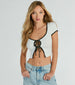This short sleeve crop top is here to stay in your weekly lineup! Its dual tie front closures and cropped hem add a playful touch. while the scoop neckline with contrast trim and stretchy rib knit fabric provides a flattering fit. Complete the look in high-rise jeans and sandals!