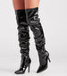 These patent leather stiletto boots meet your high fashion standards! Whether you're dressing up for a party or out with the girls. these boots are perfect. They feature a sleek pointed toe. inner zipper closure. and a sexy thigh-high shaft height. Complete the look with a sultry mini-dress.