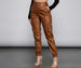 Slay in pants that are part casual. part glam! The pants feature a high-rise waist. a single button with zipper closure. belt loops. slant pockets. cargo pockets. and a skinny leg fit with a tapered ruched hem. The pants are composed of a lined faux leather fabric that offers a form-hugging fit with slight stretch. Complete the look with a bodysuit and combat boots.