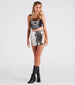 Hit the lights. because you'll be the main attraction in this sequin chain belt skirt that will showcase all the shine! It features a high waist fit with a chain-link design. a short skirt silhouette of circular reflective sequin accents. and a sultry side slit detail. Style with a graphic tee and cowboy boots for a music festival or a party!