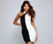 Showcase your iconic diva status in this mini dress that is perf for achieving that fashionista look. It features a sleeveless halter neckline with tie straps at the back of the neck. an open-back design. and a short. curve-hugging silhouette. The stretchy knit fabric has a fab black and white color block pattern. Style this dress with knee-high boots for a chic vibe.