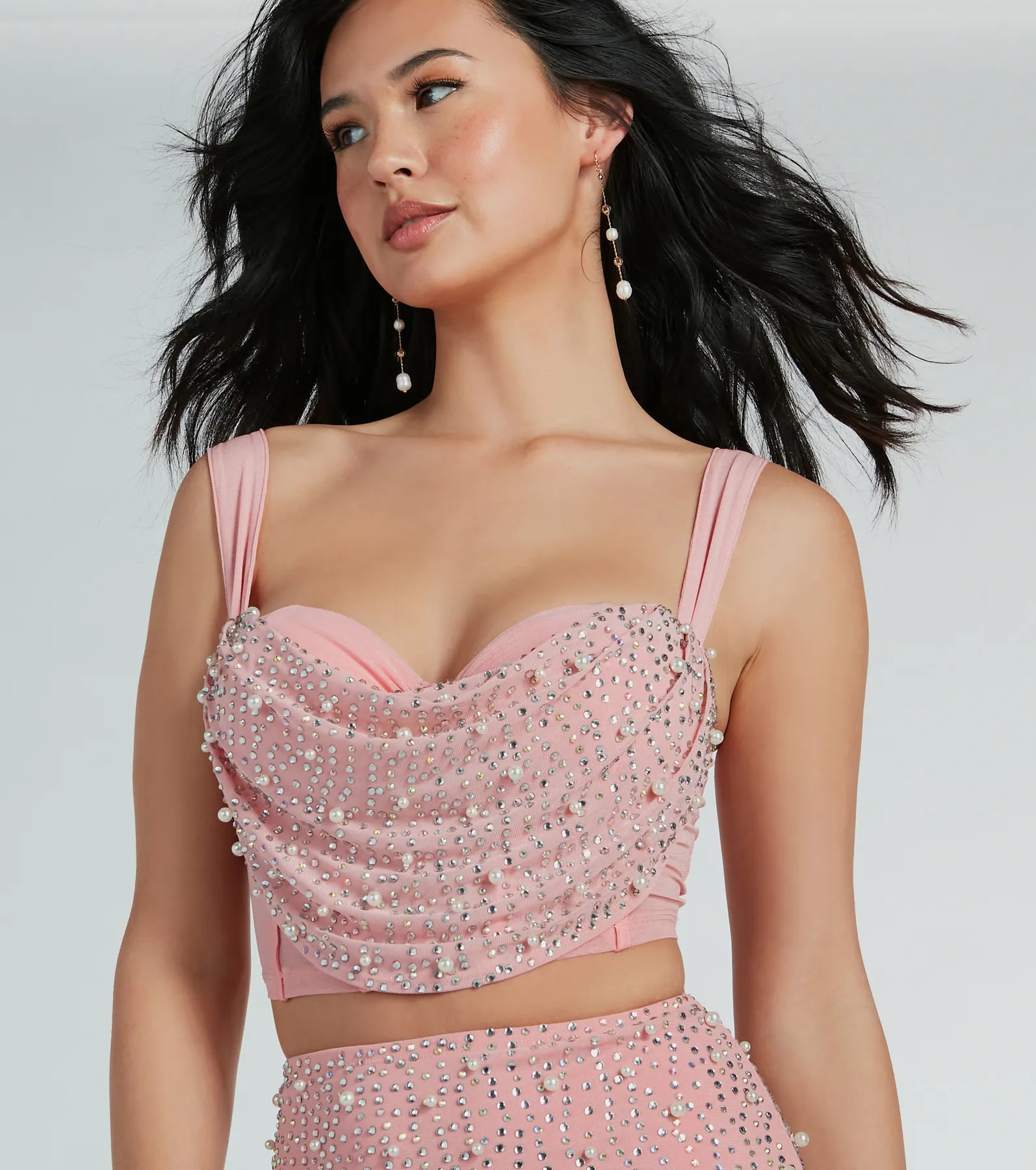 Glitz and gleam and showcase iconic glamour in this embellished bustier top! It features a sleeveless sweetheart neckline. thin shoulder straps. a sheer mesh bodice with front vertical seam detailing. a cowl-draped overlay with sparkling rhinestone and faux pearl embellishments. and a fitted cropped hem. Complete your night-out vibe with the matching mini skirt!