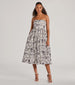 Enchant everyone in this whimsical floral forest printed midi dress at garden parties or showers! Designed with a floral forest print on cotton woven fabric. this darling dress puts on a delightful allure. It features a strapless neckline. a stretchy smocked back. hidden side pockets for keeping your hands warm. and a flattering A-line silhouette. Complete the look in sleek stiletto heels and a purse.