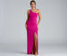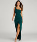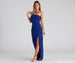 The lovely Iris long formal dress will set the tone for elegance! Captivate any room you walk into! She features a one-shoulder strap design. a padded bust for support. and a curve-hugging wrap skirt with a sexy high slit. The floor-length silhouette elongates your figure on crepe fabric with a moderate stretch. Complete your stunning look in this long dress with dangly earrings and statement heels.