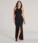 A sparkling glitter formal dress that features a halter neckline. a cutout back that turns heads. and a high front wrap slit along the slim floor-length silhouette. Perfect for the school dance or a black tie gala.