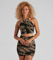 Style up this lightweight mesh crop top to look like you're ready for an island getaway! It features a sleeveless halter neckline. ruched seams down the front and back. a cropped. form-hugging fit. and an all-over palm leaf print. Style with the matching mini skirt.