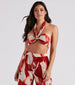 You'll be on total island time in this bold floral tube top! It features a strapless sweetheart neckline. a tie-front design that can also be styled as halter straps. an ultra-cropped. fitted hem. and an abstract floral print pattern that will draw everyone's attention to your chic look. Style with the matching wide-leg pants for a vacay-ready 'fit.