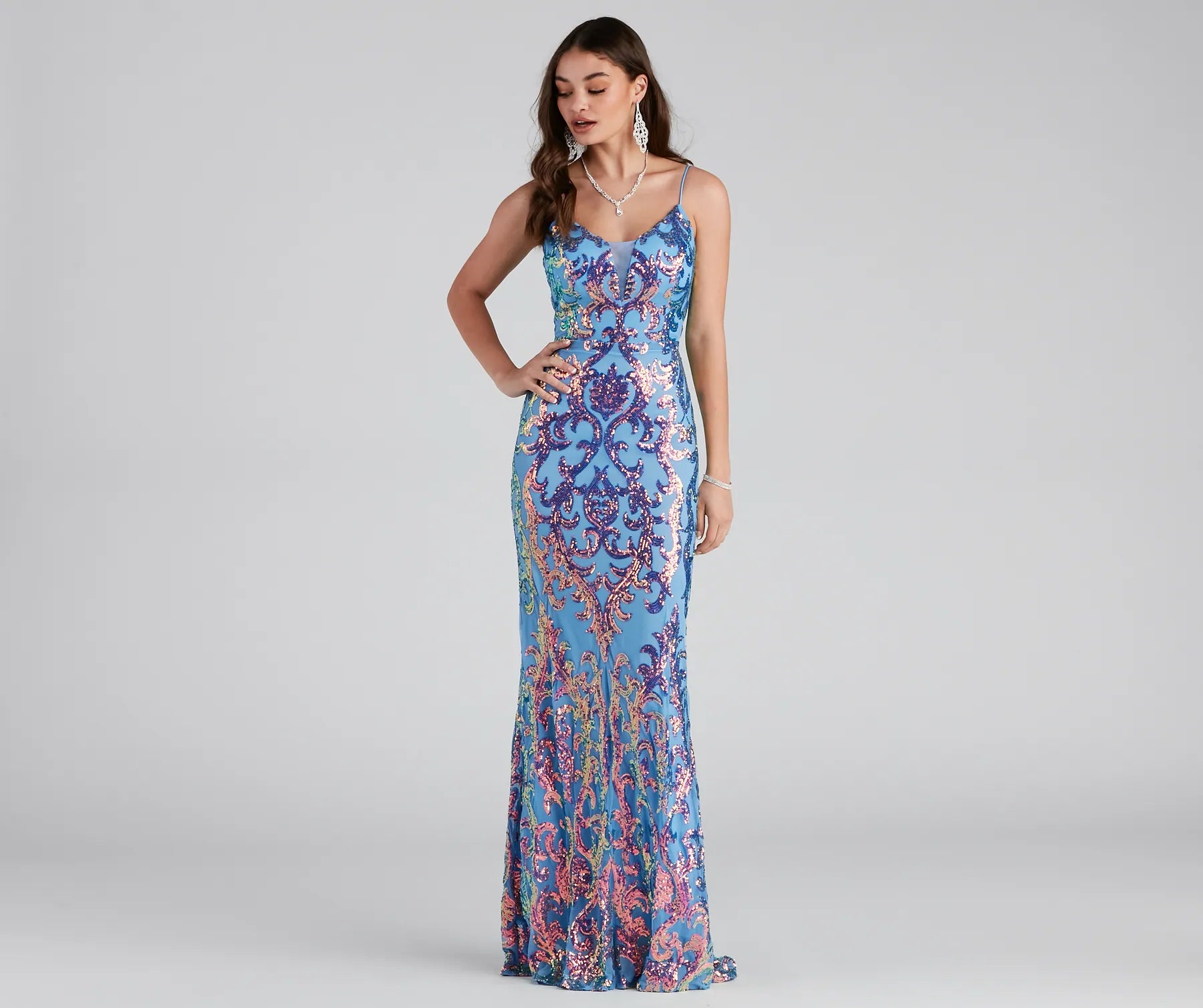 Shine bright like a diamond this prom! The Izzie formal dress brings the glitz and gleam so you can sparkle all night. She features a classy sleeveless. plunge v-neck with a mesh insert. tank straps. a built-in padded bust. and a fitted bodice. Showcase your sultry back in her low-cut back design sure to catch some glances. She has a sophisticated mermaid silhouette that leads to a floor-length hem that creates an elongated figure. The formal dress is composed of sequin embroidered fabric with an inner lining and no stretch. Complete the look in chic block heels.