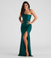 Stunning for bridesmaids and upcoming holiday soirees. the Jailene formal dress delivers a sleek silhouette with sultry detail! She features a sleeveless one-shoulder neckline. a tank-style strap. center front ruched seam atop her sexy high-cut slit leading to her floor-length hem. The formal dress is composed of a light shiny knit fabric with a moderate stretch. Complete your dressy look with a rhinestone bracelet and clutch.