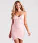 Play up your sparkle in the Janelle sequin party dress destined for the dance floor at prom. quinceaneras. or weddings! She features a sleeveless V-neckline with a sheer mesh insert. adjustable spaghetti straps. a padded bust. a bodycon silhouette. and a faux wrap mini-length hem. The formal dress is composed of a sequin-embellished fabric with a stretchy knit lining. Complete the look in glam rhinestone spiral heels.