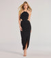 You'll sparkle in this glitter formal dress featuring a halter neckline and a cutout back with a tie. The slim silhouette boasts a wrap front slit along the floor-length hem to give a little drama.