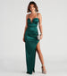 Elegance comes easy in the Jessa formal satin dress designed in a sultry silhouette to showcase your true beauty! She features a sleeveless V-neck with a wire insert. adjustable spaghetti straps. and side ruched seams that accentuate your curves. Her floor-length hem offers a show of leg thanks to the high-cut side slit perfect for styling with rhinestone heels.