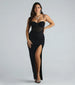 A sheer bustier-style bodice on the Jill formal dress snatches your figure to create a sexy look! She features a sweetheart neckline. adjustable spaghetti straps. a pleated built-in padded bust with underwire support. a sheer bodice with flexible boning inserts. and a flattering slim silhouette and high front slit along her floor-length hem. The formal dress is crafted from a mesh fabric for a refreshed dressy style and has a stretchy knit lining. Complete your look for black tie galas or celebrations with a stunning hair accessory.