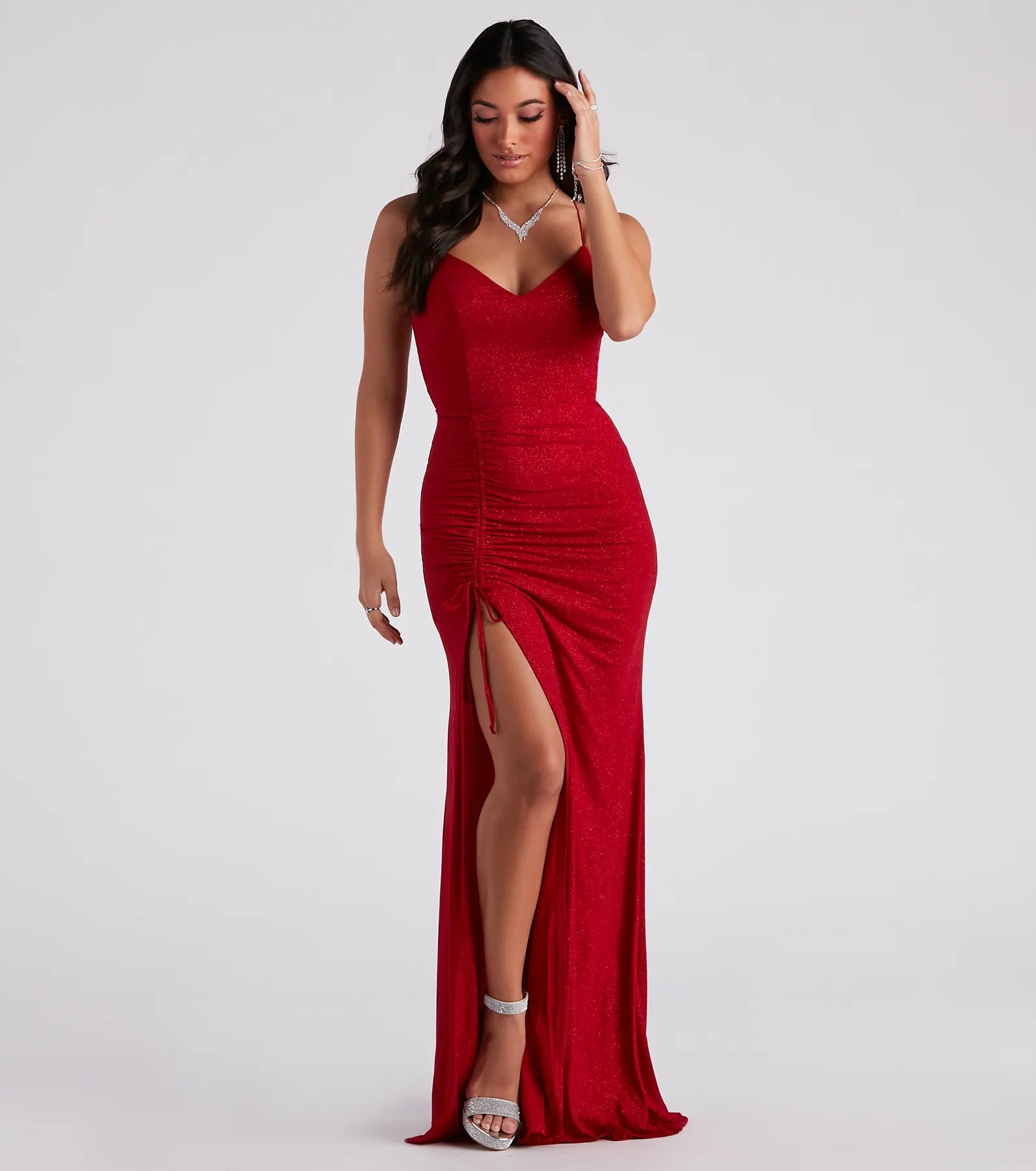 Glitzy and alluring. the Joni formal long high slit glitter dress will bring that wow factor to your next fancy soiree! She features a sleeveless V-neckline. a padded bust that eliminates the need for a bra. bungee spaghetti straps. and an open back with a thin strappy design. Her high waist leads to front ruched detailing and a sultry thigh-high slit on her curve-hugging. floor-length hem. The glitter knit fabric will give off the prettiest shimmer that is sure to have all eyes on you. Complete your look with strappy stilettos.