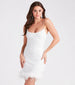 Whether you're a sassy bride or party guest. the Jovanna sequin dress is a gorgeous style for all of your upcoming events! She features a sleeveless scoop neckline. sleek bungee spaghetti straps. a bodycon silhouette. and a marabou feather trim along the short-length hem. The party dress is designed with a sequin-scroll pattern on mesh fabric that sparkles under the light and has a stretchy knit lining. Complete the look with statement earrings and heels.