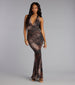 Unapologetically bold. this maxi dress is made for making an entrance. The plunging halter neckline and curve-hugging fit keep it sleek. while the strappy lace-up back and animal print bring all the wild energy.