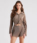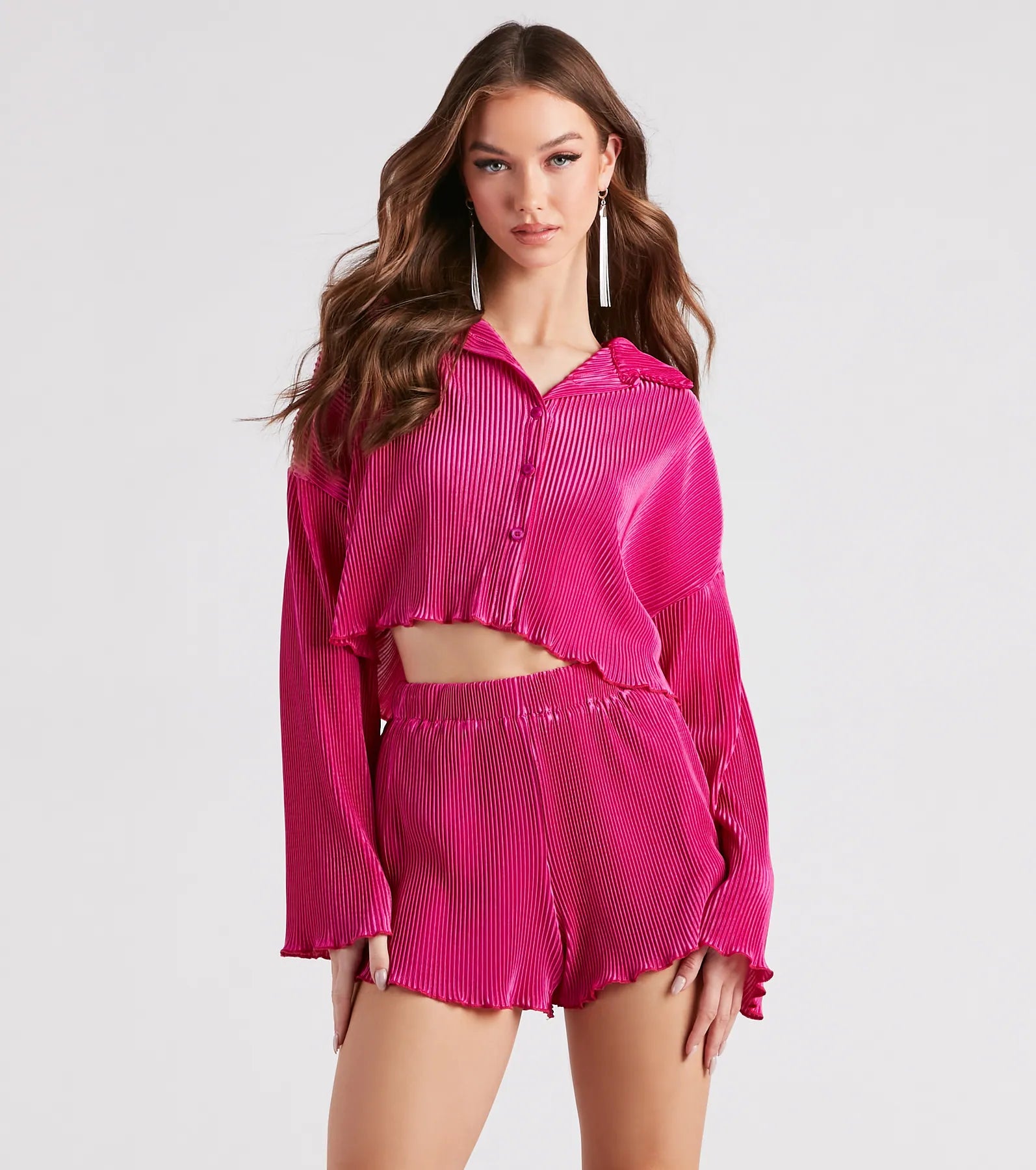 It'll start out as just a crush. but you'll totally be smitten with this top and shorts set for all of your styling needs! The top features long sleeves. a collar neckline. a button-down front. and a flowy cropped hem. The shorts feature a high-rise elastic waist and a short-length hem. Each is composed of a satin pleated fabric. Complete the look in chic clear heels.