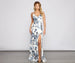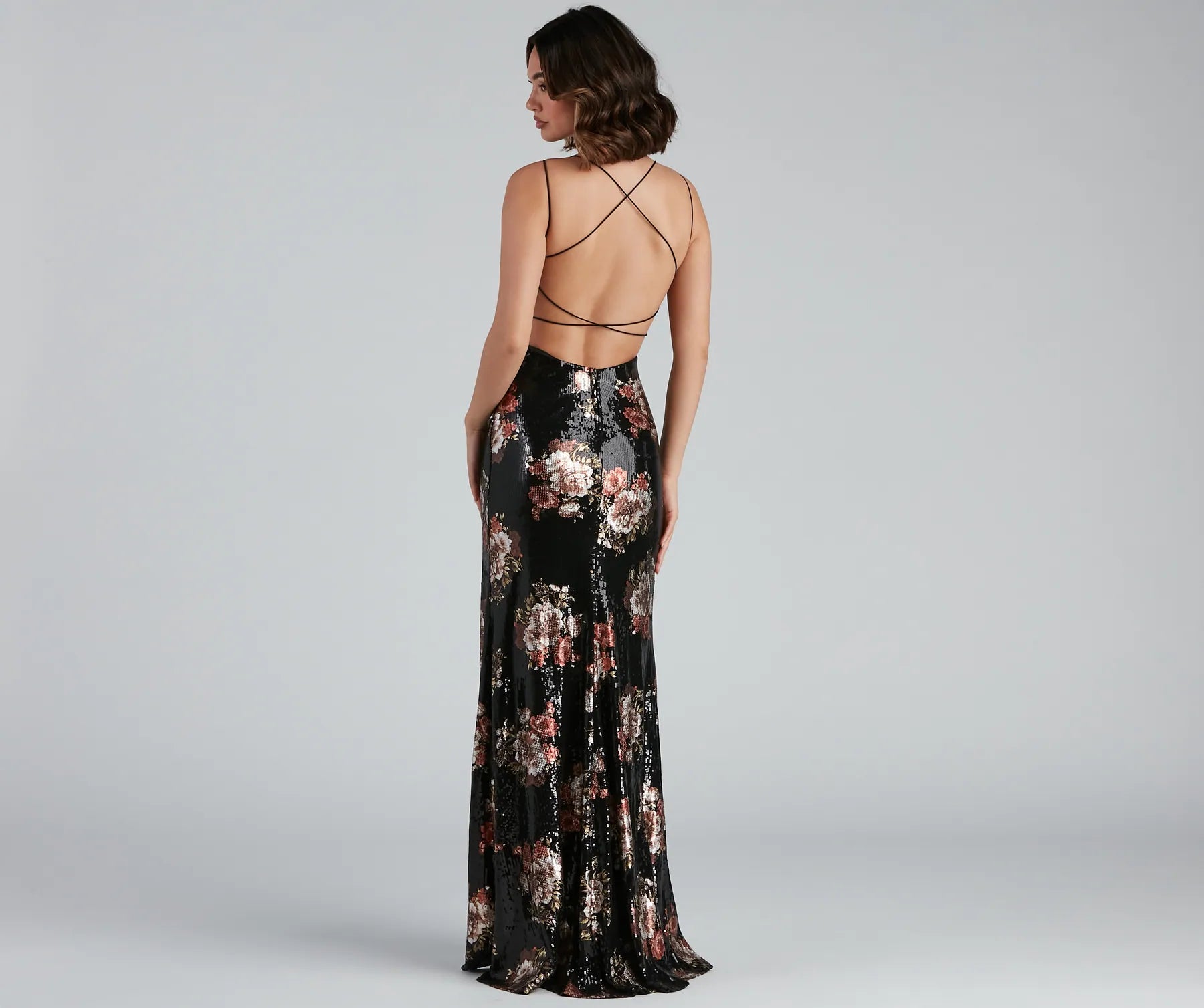 Bloom with beauty in the stunning Karissa sequin floral formal dress! She features a sleeveless bodice. dual bungee spaghetti straps. an open back with a strappy design. and a V neckline with a padded bust. Her high waist seam flows to a floor-length skirt with a thigh-high front slit. The dress is composed of a floral printed jersey knit fabric with all-over sequins and includes a stretchy knit lining. Complete your look with stunning rhinestone earrings and stylish new heels.