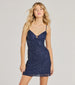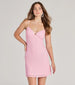 This glam sleeveless mini dress features a flattering V-neckline with bar trim. adjustable spaghetti straps. and padded bra cups for support. The A-line silhouette and mini-length hem highlight your curves.