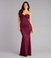 Romantic and striking. the Kathy velvet flocked gown features a strapless sweetheart neckline. curve-contouring mermaid fit. and sultry front slit. The open tie-back detail adds a modern edge. making it a flawless choice for formal evenings.