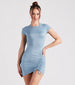 Keep it cool and casual in this effortless knit mini dress for hangs with friends! It features short sleeves. a crew neck. a bodycon silhouette. and a ruched drawstring that lets you customize the style. The dress is composed of a stretchy brushed knit fabric. Complete the look in cute flat sandals.