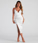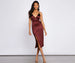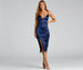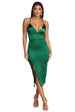 Lace-up in luxe satin as you make a captivating entrance in our Kenzie dress! She features a sleeveless bodice. a plunging V-neckline with padded cups. princess seams. and narrow straps that lead to a lattice back detail. Her slim-fit bodice leads to a midi-length silhouette accented with a side slit. The dress is composed of a stretchy satin fabric that offers a form-hugging fit with a moderate stretch. Includes a lower back zipper closure. Complete look with heels and a clutch.