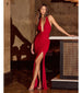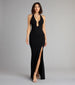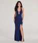 Go bold in a long mermaid dress that features a plunging halter neckline with a U-shaped bust. adjustable neck ties. ruching. a high side slit. and a captivating mermaid silhouette. Complete your formal outfit with a sleek rhinestone clutch.