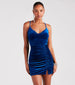 Stroll in looking so luxuriously sultry in the Kinley velvet party dress for bachelorettes or birthdays! She features a sleeveless V-neckline. a padded bust. spaghetti straps that lace up across the back. a flattering bodycon silhouette. a front ruched seam. and a flirty slit on the mini-length hem. The party dress is crafted from a soft velvet fabric that has a stretchy knit lining. Complete the look with a rhinestone bracelet and earrings to add glam to your night!