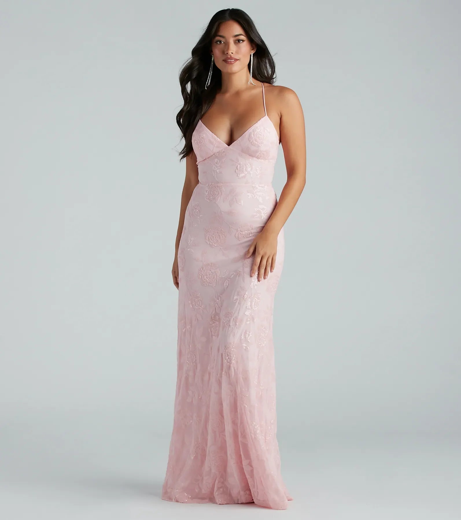The ultra-glam Kleo formal sequin dress is ready to hit the dance floor at homecoming. weddings. or formal parties! She shines in a sleeveless V-neckline. a lightly padded bust. spaghetti straps that create the lace-up back. and a curve-hugging mermaid silhouette that gracefully flows into a floor-length hem. The formal dress is designed with a unique rose sequin pattern for a fresh style on mesh fabric with a stretchy knit lining. Complete the look with earrings and a clutch!