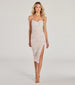 Captivating sequins lend endless sparkle while the scroll pattern elevates the Krissy formal midi dress sure to make a lasting impression! She features a sleeveless sweetheart neckline. a padded bust. adjustable spaghetti straps. a corset-style bodice with flexible boning to give you a snatched appearance. a flattering bodycon silhouette. a front slit. and a midi-length hem. The formal dress is designed with a shimmering sequin scroll pattern with a chic lace effect. Complete your look for a rehearsal dinner or banquet in strappy rhinestone heels.