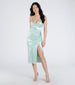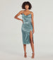 Trend right and look timeless in the body-skimming Kristen formal satin midi dress at cocktail parties. graduations. and dressy birthdays! She features a sleeveless cowl neckline. spaghetti straps. a front ruched seam that accentuates your curves. a bodycon silhouette. and a sultry slit along her hem. The formal dress is composed of a luxurious silky satin-lined fabric with minimal stretch. Complete the look in rhinestone strappy heels.