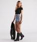Reach stunner status in these eye-catching denim shorts to make your glam appearance at weekend festivals. concerts. or bar hopping with the girls! They feature a flattering high-rise waist. side cutouts with rhinestone lace-up packets. and a frayed cut-off style hem. Complete the look in cute cowboy boots and a hat!