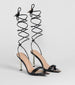 You'll be laced up in sleek style with these strappy stiletto heels! They feature an open pointed toe with a gold metal trim accent. thin toe straps that form a faux banded design. an open back. long thin straps that can be laced up around the leg or styled by the ankle. and a circular gold stiletto heel. Pair these fab stilettos with a chic clutch.