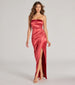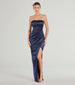 A stunning satin formal dress features a strapless neckline with padded bra cups for support. a side pleated seam. and a high front wrap slit along a slim silhouette. The silky satin fabric offers a subtle sheen effect and stretch.