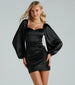 Look ravishing in this lavish satin mini dress on your next girl's night out! It features long bishop sleeves. a sweetheart neckline. a corset-designed bodice with flexible boning inserts for a structure. side ruching. a faux wrap mini-length hem. and a bodycon silhouette. The silky satin fabric has a minimal stretch. Complete the look in this mini dress with glitter heels.