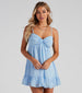 You'll be ready for weekend brunch with your girls in this adorable swiss dot woven skater dress. It features a sleeveless V-neckline with a twist-front design. spaghetti straps. an open back with a cute tie-back detail. a high waist seam. and a short skater-style silhouette with a ruffled hem. Style with wedges and chic shades.