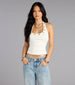 This rib knit halter top levels up your everyday look with bold grommet trim and a sleek fit—perfect with jeans by day or leather pants by night.
