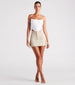 Level up your cute and casual everyday look with this of-the-moment cargo mini skirt. It features a high-rise waist with belt loops. a front button closure. back pocket flaps. cargo-style side pockets with adjustable straps and buckles. a mini-length hem. and a form-hugging fit. Style with a corset top and clear mules.