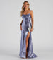 Spice up your red carpet look in the Lex formal dress showcasing plenty of skin for some sultry vibes. She features a sleeveless. scoop neck. adjustable spaghetti straps. and an alluring open-back with a satin lace-up tie closure. Her form-fitting silhouette cascades gently to the floor-length hem with a high-cut front slit perfect for flaunting fab stiletto heels.