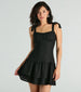 The sweetest eyelet mini dress for shower celebrations. graduations. or brunch! It boasts flirty tie shoulder straps. a flattering bodycon silhouette. and a ruffled hem for cute flair.
